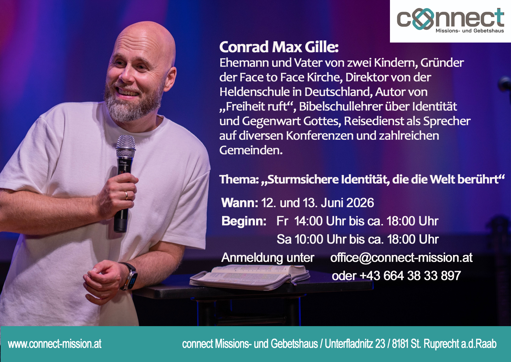 Ehemann und Vater von zwei Kindern, Gründer der Face to Face Kirche, Direktor von der Heldenschule in Deutschland, Autor von „Freiheit ruft", Bibelschullehrer über Identität und Gegenwart Gottes, Reisedienst als Sprecher auf diversen Konferenzen und zahlreichen Gemeinden. Wann: 12. und 13. Juni 2026 Beginn: Fr 14:00 Uhr bis ca. 18:00 Uhr Sa 10:00 Uhr bis ca. 18:00 Uhr Anmeldung unter office @connect-mission.at oder +43 664 38 33 897